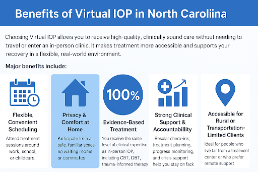 A Virtual Intensive Outpatient Program (IOP) gives you structured, clinical support for addiction recovery — all from the privacy and comfort of your home. It delivers the same evidence-based therapies, accountability, and connection you’d find at our in-person programs, but through a secure telehealth platform you can access anywhere Near Charlotte, NC.